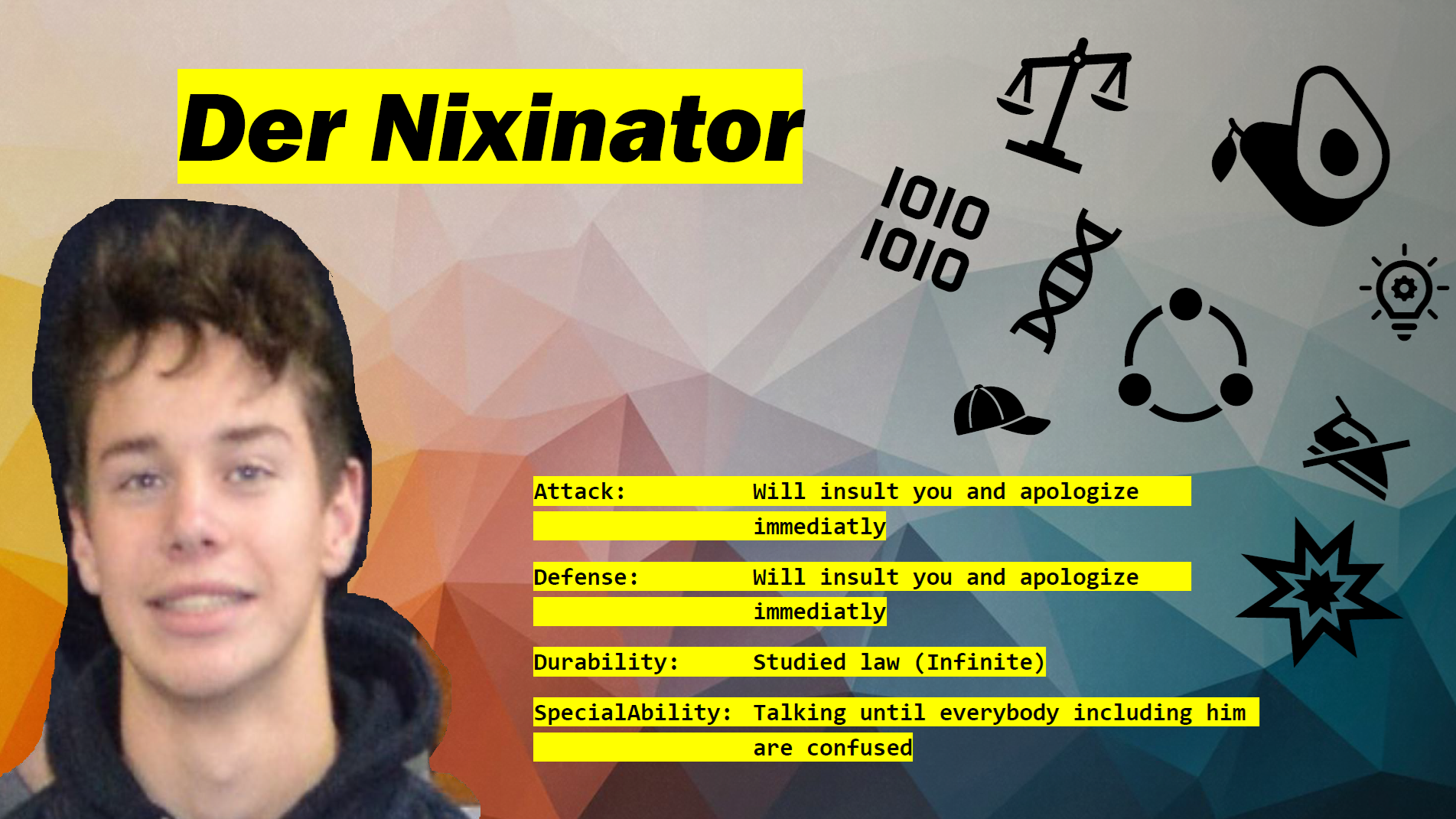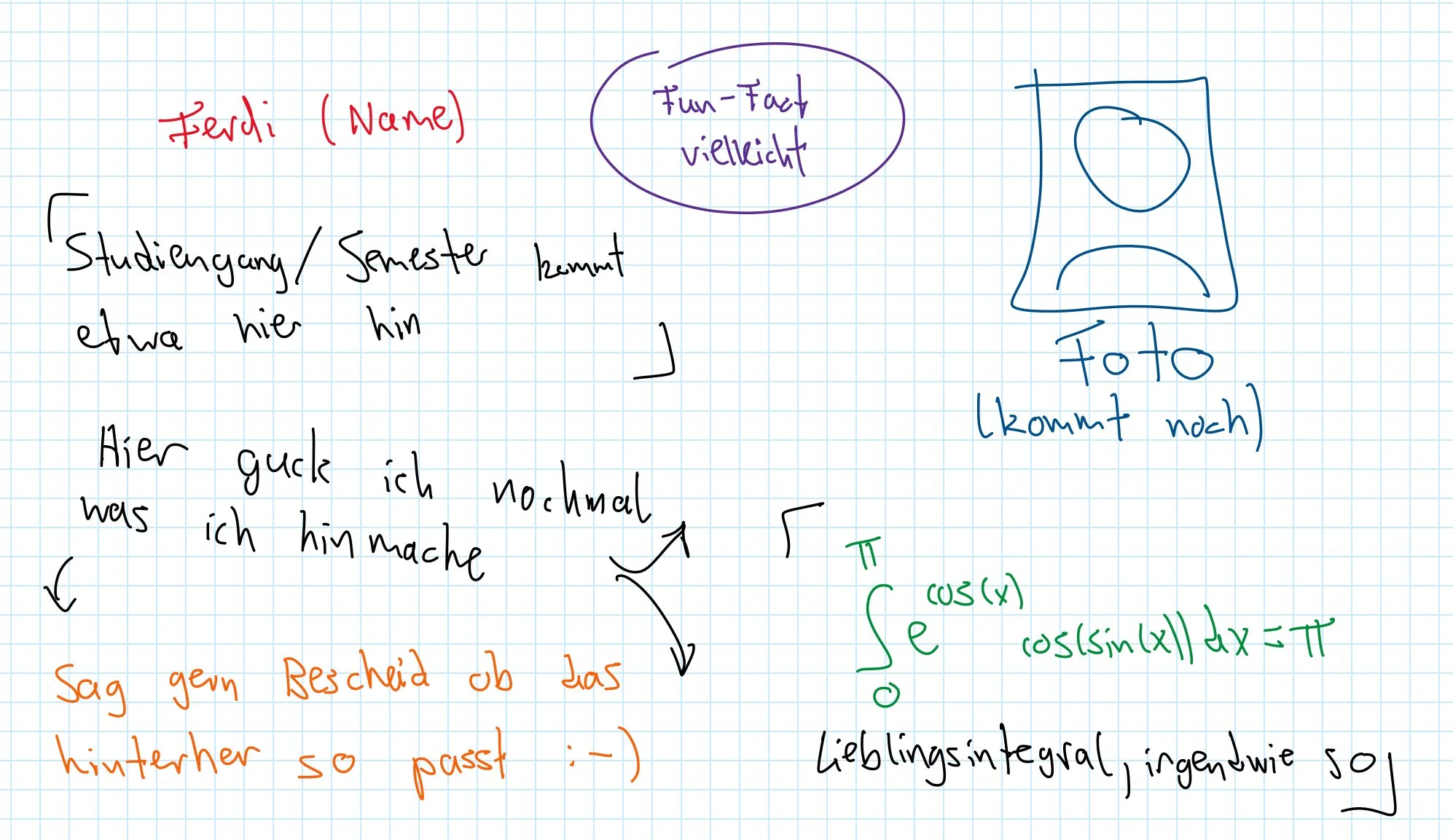 Einlauffolie: Wenn du möchtest, kannst du uns eine Folie (egal in welchem Format) schicken in der du dich vorstellst. Diese wird dann eingeblendet wenn du einläufst. Der Inhalt ist völlig dir überlassen und kann von witzig bis hin zu absurd oder ernst reichen. Im Folgenden sind ein paar Beispielfolien.